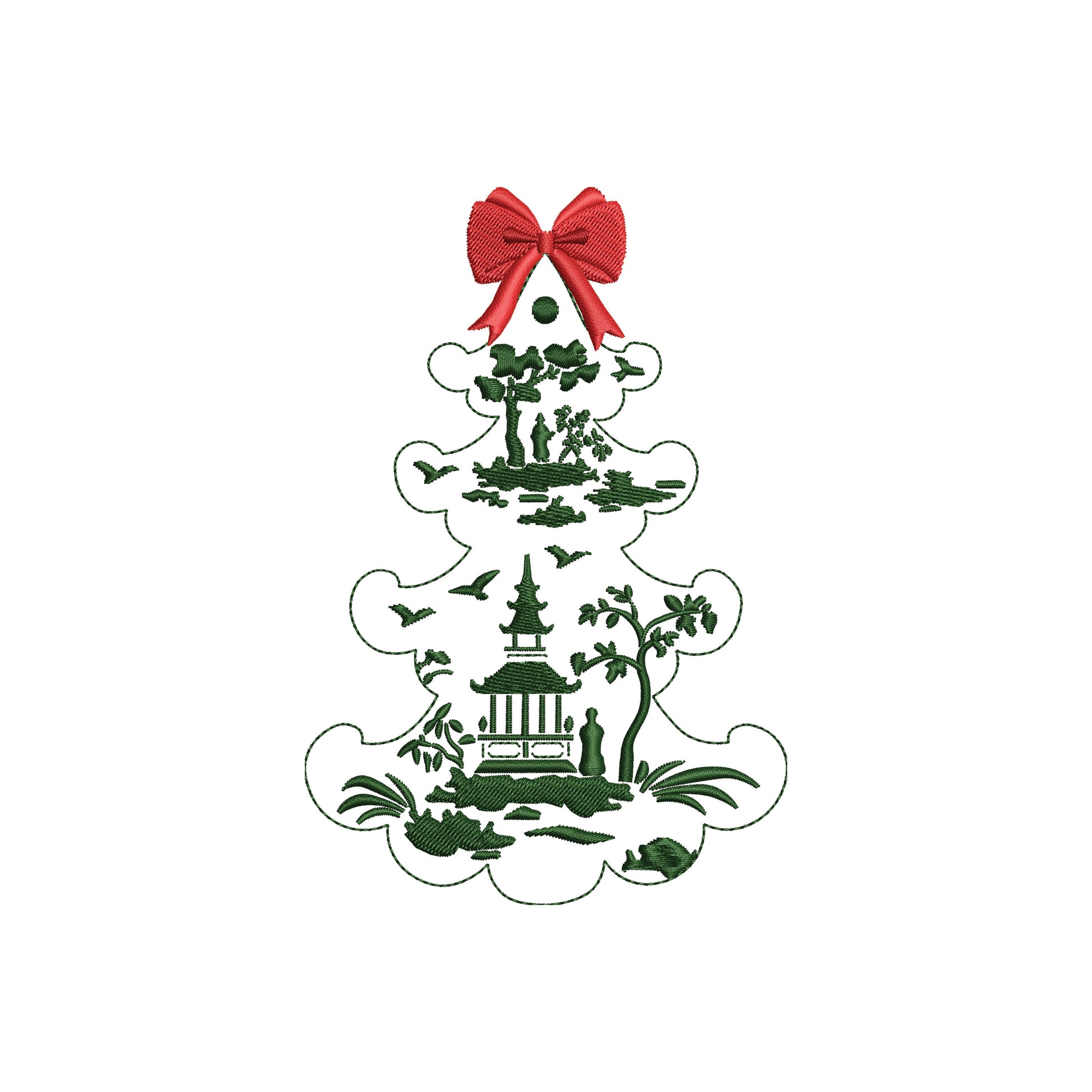 Chinoiserie Print Christmas Tree with Bow Digital Machine Embroidery File- 4 SIZES